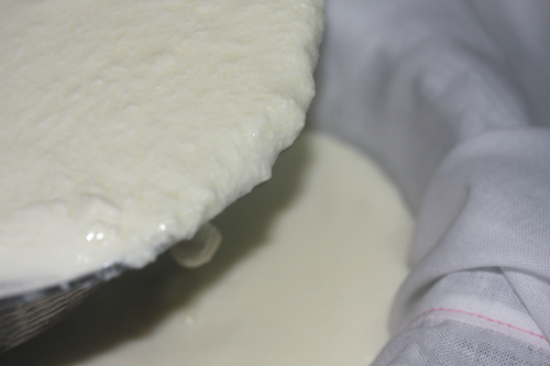 布を絞った状態で、口を紐で縛り、紐を割りばし等に取り付ける。ビールジョッキ位の大きい瓶に、割りばしをかけて布を吊るす。この状態で冷蔵庫に入れ溶けば、カードの重みでホエーが自重で放出される。面倒であれば自力で絞ってもいいが、ちょっと味が落ちます。