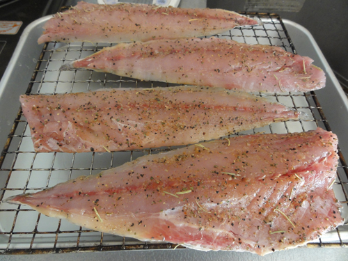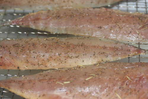 上記塩、ハーブ、スパイスをブレンドし鯵にすり込み、冷蔵庫で一日寝かせます。