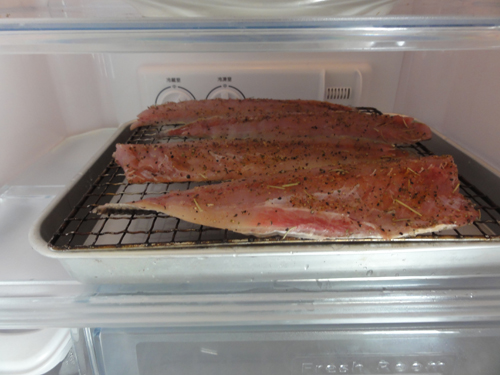 これで食べてもいいのですが(食べ方はそのままか焼いて食べる)、出来れば1~2週間冷蔵庫で脱水させセミドライに仕上げます。