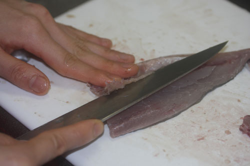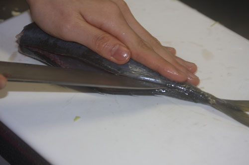 普段まったく料理をしないのですが適当におろしてみました。たぶんポイントは良く切れる包丁を使うこと!皮はとらなくてOKです。おろした後はキッチンペーパーでかるく水気をふき取ってください。