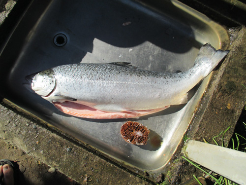 ブリキ製のゴミ箱にスモークウッドとピートを入れていざ燻製。時間は2時間ほど。それにしても鮭は燻製にすることで、更にうまみが増す不思議な魚である。燻製後1日寝かせたら完成だが、3ヶ月くらい(春先迄)干して、一匹丸ごと鮭とばにするのもいい。