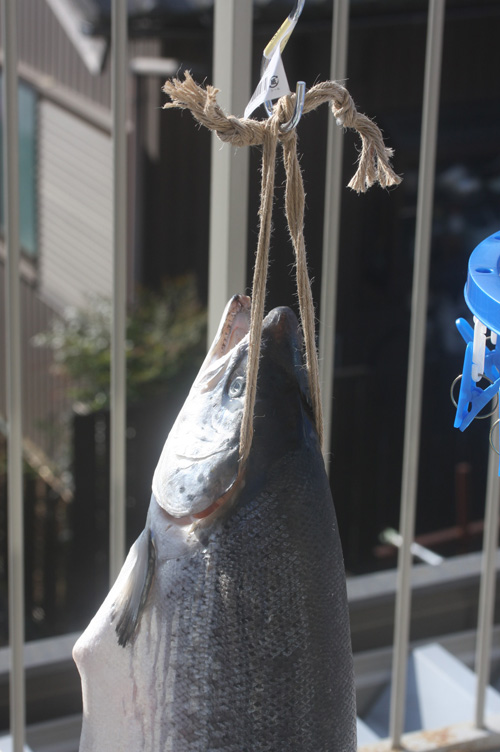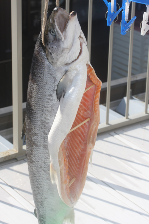 ここから30日以上、外で脱水をさせる。仕上がると完全に鮭の剥製である。部屋に飾り少しずつナイフで身を削ぎ食べるとたまらない!スモーキーで酒が進む!知り合いにプレゼントをしても絶対に喜ばれる。ヒレは炙って鮭のヒレ酒にするといい!これも最高だ。脱水が効いているので、夏でも常温で大丈夫!ただ夏前になくなることも多いw9