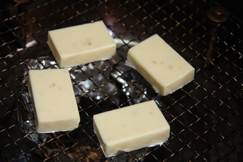 20分燻煙した状態。上がアーモンド入り、下がブラックペッパー入り。このまま食べてもチーズがとろけて美味しいのですが…ここはガマン。粗熱が取れる迄風乾燥させた後冷蔵庫で最低2時間程寝かせます。