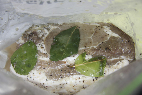 空気をなるべく抜いてローリエを入れチャック!冷蔵庫で5~14日間寝かせる。その間一日一回、肉の上下を反転させ塩を均等に浸透させる。ちなみに今回は5日。浅い熟成ですが塩抜きが楽!