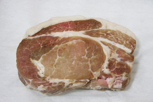 お肉屋さんで豚ロース肉500gのブロックを頼みます。