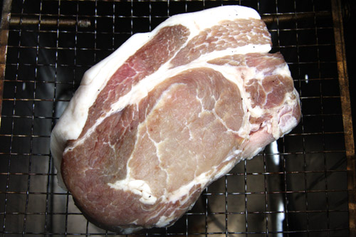 今回はいつものアメリカ産が無かった為、止む無く国産のブランド豚100g240円のロースを購入。見た目にいつも買うアメリカン産とは違う。これは旨そうです。まずはロース肉を均等に塩が入る様に串刺し。自分の場合はフォークでグサグサします。