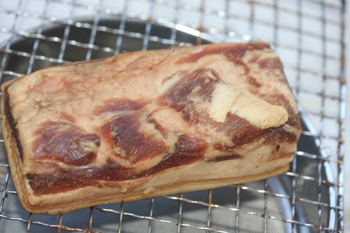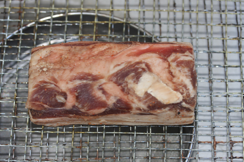 気温2℃。1月に一日放置(風乾燥)した豚バラ。風乾燥前の上の写真と比べてみると一目瞭然!見事に脱水されてます!それにしても冬は本当に脱水が楽です!