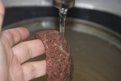 1日後冷蔵庫から取り出し、牛肉を流水で洗いながら水をはったボールに移し変えます。ここから塩抜きですが…