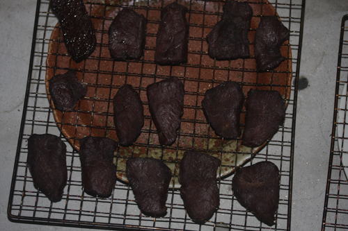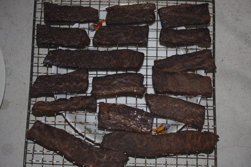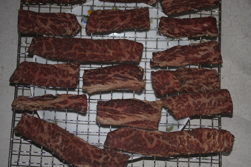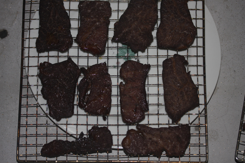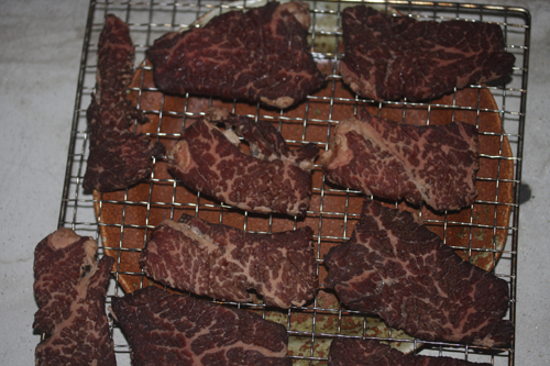 ・薄口な人は水をはったボールを冷蔵庫へ入れ30分位塩抜きします。ポイントは一度焼いて味見をしてみること。ここがビーフジャーキーの、仕上がりの味を左右しますのでシビアに行きましょう!