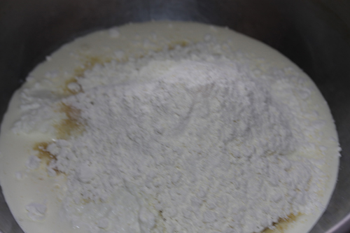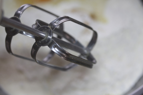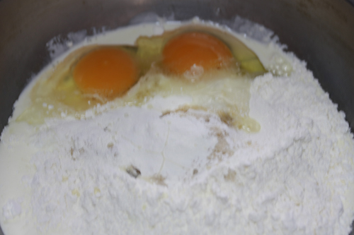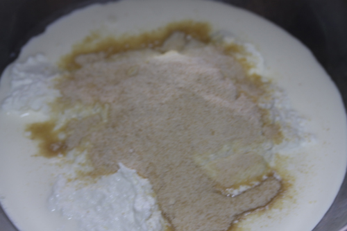 上記材料:生クリーム・カッテージチーズ・砂糖(今回なかったので三温糖)・薄力粉(ふるった)・卵を泡立て器でなめらかになるまで混ぜて、型に流し込みます。