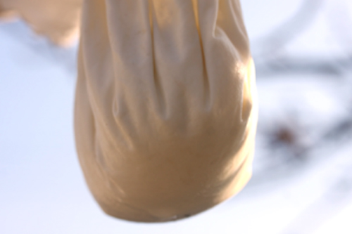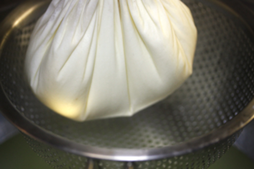 濾した布をそのままの状態。もしくは、逆さテルテル坊主状態で吊るし、6~24時間放置しゆっくりホエーを排出する。時間はかかりますが、仕上がり的にはこれがベスト。個人的には12時間放置した後、布を軽く絞って、好みの水分量に仕上げています。