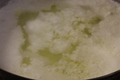 10~15分位攪拌し、上記のようにホエーとカードが目に見えて分離してきたら完了。