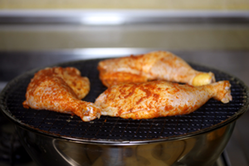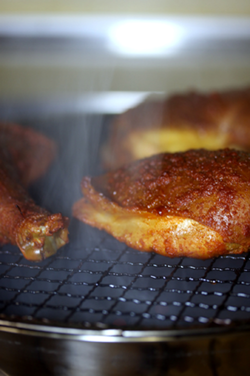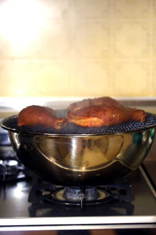 煙が出たら肉をセットをして蓋をし20分燻製。途中肉に付く水分をふき取ります。20分後200℃40分位オーブンで焼き上げて完成です。