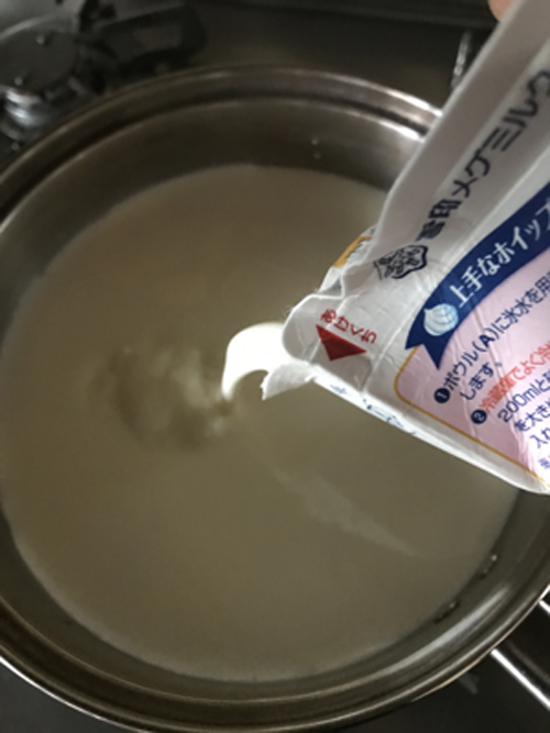牛乳500㏄+生クリーム200㏄+ヨーグルト180gを40℃まで温める。