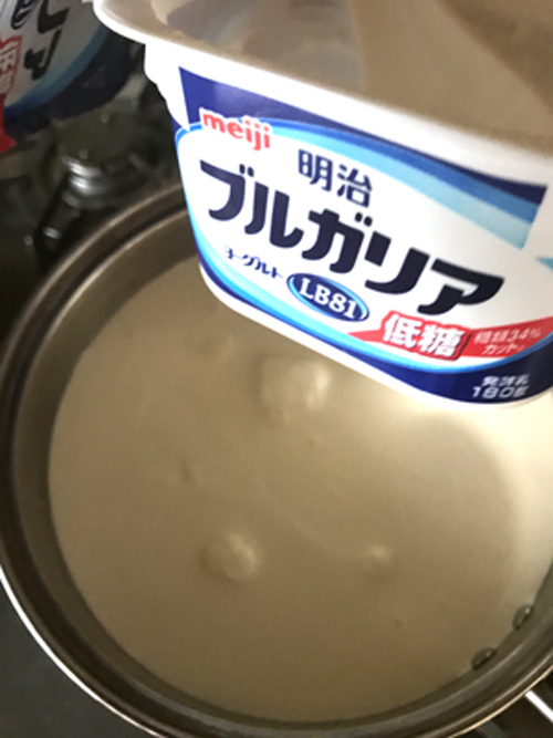 弱火でゆっくり攪拌しながら、上記材料を温めます。ヨーグルトは砕いてください。