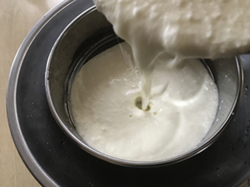 ▼ラップをして冷蔵庫で24~48時間ホエーの排出を行う。
