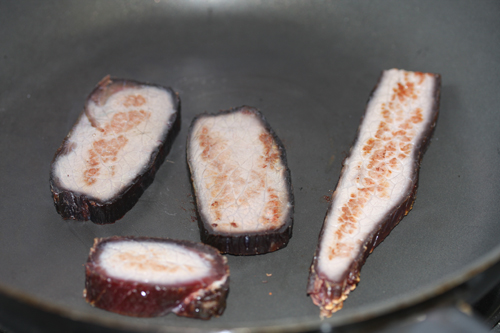 フライパンで焼いて食べる。通常外側はトリミングをしますが、そのまま食べました。味はかなり美味しいのですが…これはやはりプロの方が作らないと衛生面等、色々大変ですね