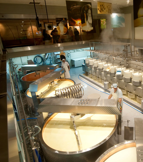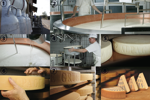 天然飼料の牛から、採れた生乳を使用。 ちなみにグリュイエールAOPの1輪を作るために必要とされ牛乳の量は400リットルである。