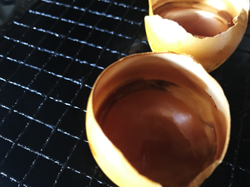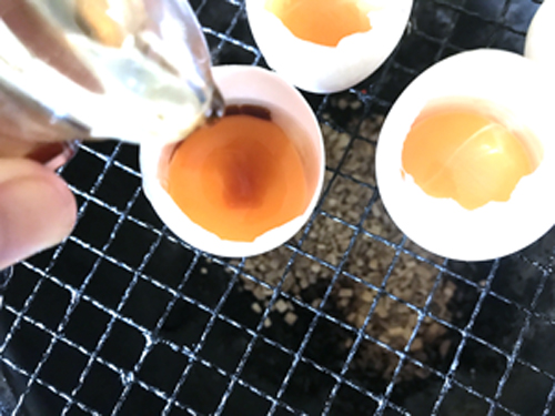 ▼殻付きの卵黄に醤油をたらしたら燻製開始