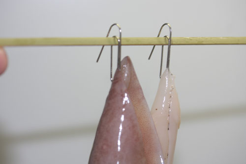 1日後軽く流水で洗い流してキッチンペーパーでしっかり水気をふき取ります。次にクリップを使ってイカを吊るします(上記写真参照)。竹串に直接刺してもいいのですがクリップの吊るしはかなり楽でおススメです!後は冷蔵庫で1日風乾燥。冬場なら外がおススメ!乾燥が速いです!