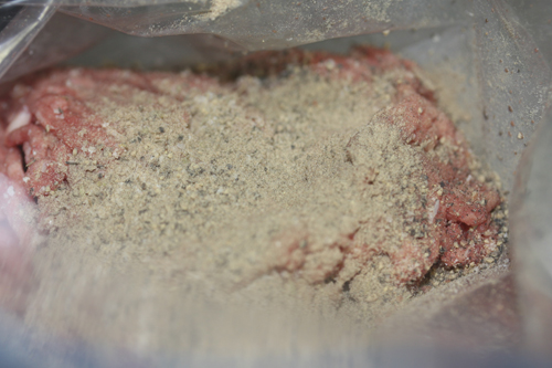 挽肉を2.5%のクレイジーソルトで捏ねます。クレイジーソルトがない場合は塩とブラックペッパーと好みのハーブでOK!