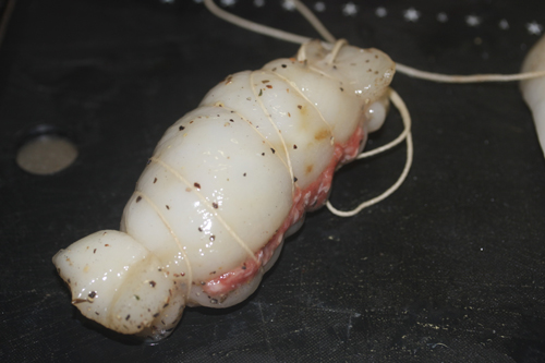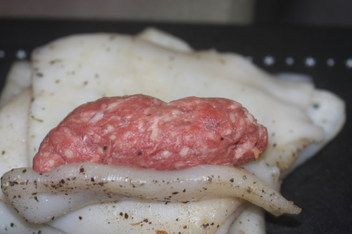 挽肉をイカでケーシングする。