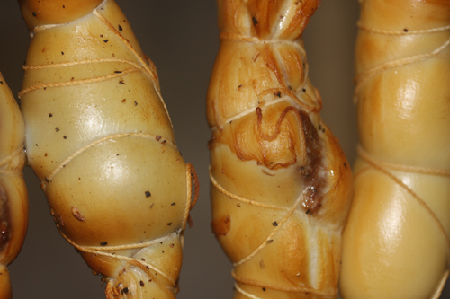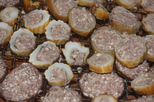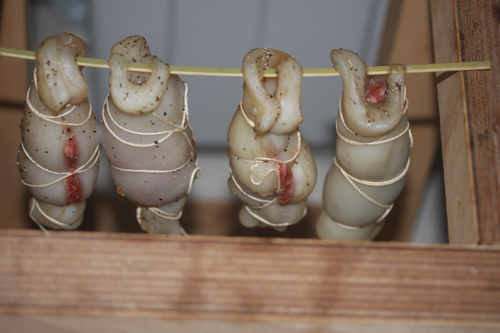 挽肉をイカで巻いて紐で縛り、一日風乾燥。