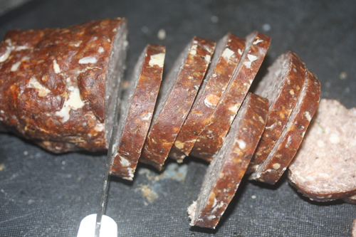 最初そのまま冷蔵庫に入れたのですが全然脱水してくれなかったので、輪切りにして冷蔵庫で4日完璧に脱水。ドライ-イカソーセージの完成。