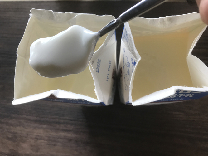 牛乳200㏄を抜いた牛乳パックに、ヨーグルトを200gいれます。生クリームバージョンヨーグルトは、雪印フレッシュを1箱入れます。この状態で常温で1日寝かせればヨーグルトが完成する。
