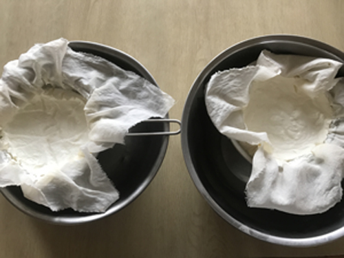 生クリーム入り、牛乳だけのもの、どちらもヨーグルトが完成しています。通常これを冷やして食べますが、自分はさらに水切りをします。自家製ヨーグルトは、なんだかんだ、味が落ちますが、水切りをすることで市販品を凌駕する逸品になります。