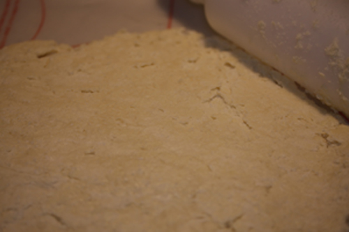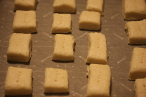 生地がまとまったら、伸ばして折ってを3~4回繰り返し、カットします。200℃30分・オーブンで焼く。