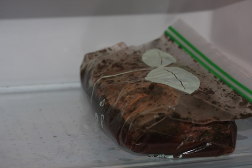 ・再びチャックを開け赤ワインを注入(赤ワインは入れなくてもOK。クラテッロ作りでは本来使用しません。ただ短時間で作ることと、赤ワイン自体スーパーでフルボトル300円台で売られていることを考えれば使用することをおススメします) ・チャックをしっかりして冷蔵庫で7日ほど寝かせます。