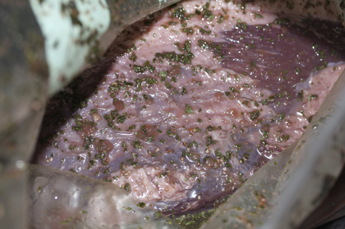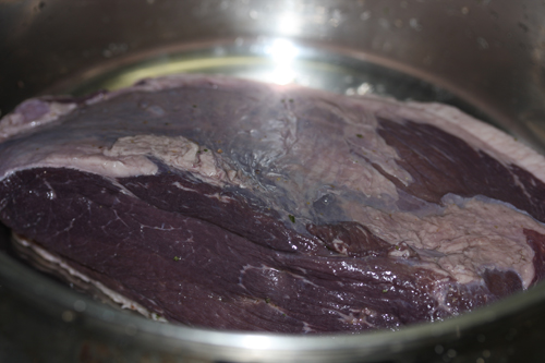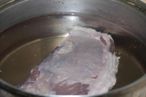 7日後冷蔵庫から取り出し、ジップロックを開けると紫の肉が!?肉を取り出し流水で表面を洗い流した後、水をはった鍋やボールに入れ、冷蔵庫で5~8時間放置。ポイントは5時間経ったら一度切れ端をフライパンで焼いて味見をすること。自分の舌を信用していい塩加減ならOK。逆に塩辛いなら塩抜き続行!ココで妥協すると成功は無いです。▼塩抜き完了→ピチットで脱水へ