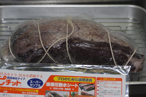 塩抜き終了後はピチットで脱水。シートに包んで冷蔵庫で24時間。じっくり熟成させたいのですが、短時間で冷蔵庫熟成なので、やはり最初の脱水はピチットシートをしっかり使いたいです。▼1日で見事に脱水。