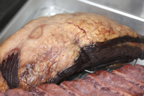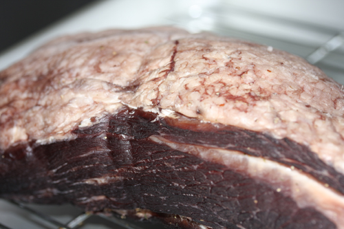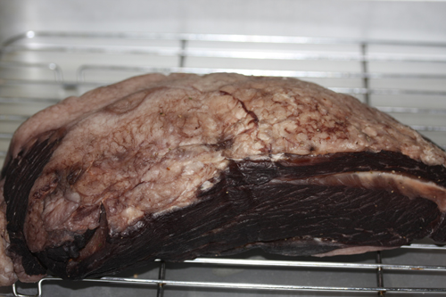 冷蔵庫で熟成1.5ヵ月後。切ってみると生ハムの感覚!そして味わいはハムの王様、クラテッロに引けを取らない味わい。このまま食べたい所ですが…