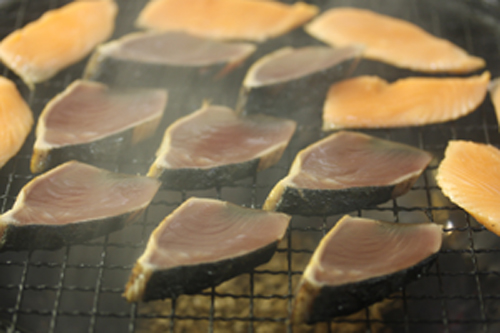 ▼カツオたたき、サーモンも瞬間燻製