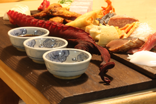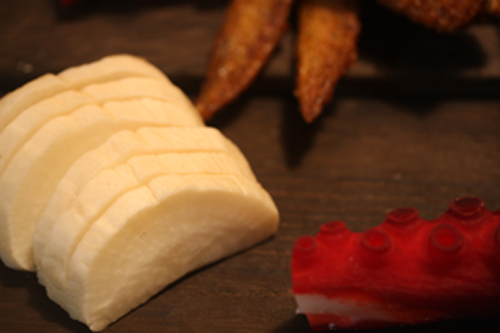 マグロ・カツオ・サーモンは瞬間燻製で仕上げていますが、イカはあえて燻製をしていません。燻製ワサビをつけて食べてもらう用です。イカの刺身に燻製わさびを乗せて食べると…これも最高に旨いです。