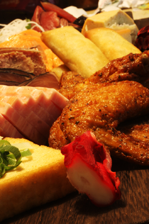 基本は好きな燻製を作るのが一番です。今回自分が作ったのはポン酢、からし、わさびの燻製がポイント。これにつければ結局全てが燻製風味になり、大人数のパーティー時には重宝します。後は揚げ物、刺身、長期熟成系燻製でまとめました。