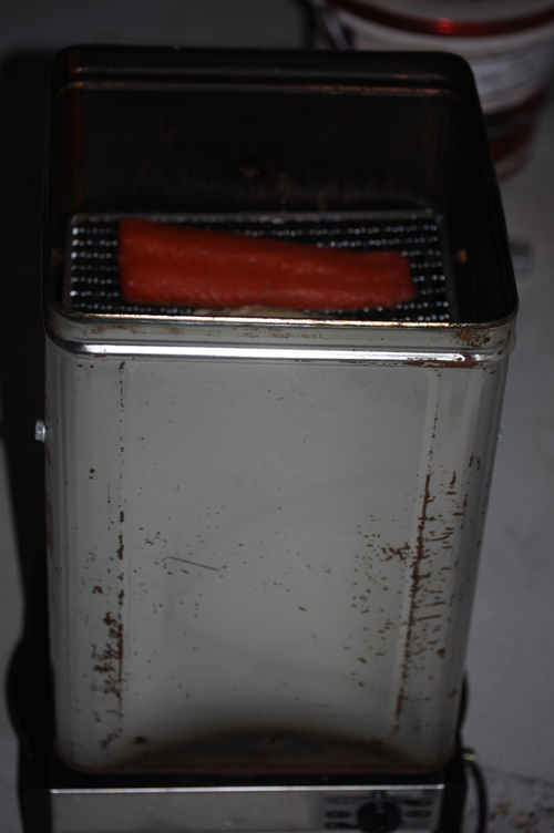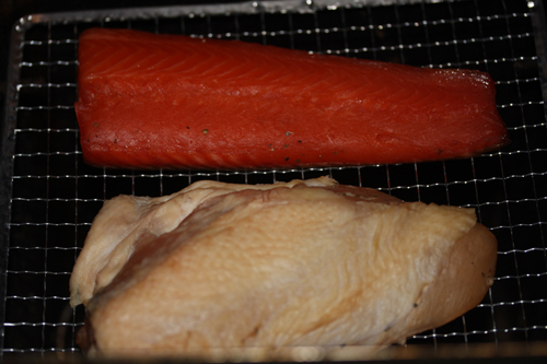 熱源はガスコンロで行きたかったのですが風が強いので、電気コンロ600Wを使用。約100度で60分燻製。(サーモンは20~30分でもいいのですが、面倒だったので鶏肉と同じだけ燻製)