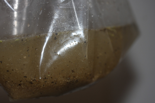 ジップロックに入れるニジマスの重さに対する4%の塩を準備。後はブラックペッパーやハーブなどを入れる。その後ワインを180mmlを入れて、シェイクしてソミュール液が完成。ちなみに今回は赤ワインバージョンと、白ワインバージョンのソミュール液を作ってみました。どちらが美味しく仕上がるのか!?