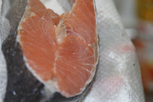 60cm級のニジマスは、はんぱなくでかいw。適当にぶつ切りにします。