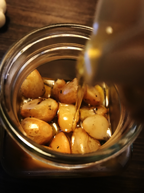 イタリアン系の料理に使うとスモーキーに仕上がり、全てがランクアップする調味料。一般的な作り方は、オリーブオイルをそのまま燻製するか、液体燻製用の燻製器で燻製をするかであるが、一番美味しい燻製オリーブオイルは、燻製ニンニクのオリーブオイル漬けである。