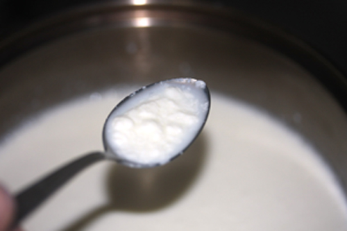 多分3㏄位で大丈夫な気がしますが、とりあえずちょっと多めに小さじ1程度投入。しばらく攪拌してから火を消し、蓋をして1時間ほど放置します。牛乳の温度はちょうど40℃。