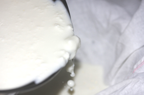 カードを濾します。本来布を吊るして、自重でホエーを12時間くらいかけて排出したいのですが、今日はデザートチーズを、この後食べなければならないので、強制的に搾って排出。