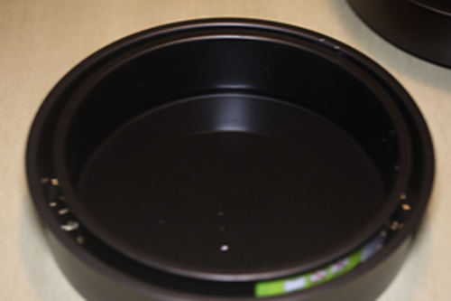 21㎝のケーキ型にチップを入れ、その上に水を入れた18㎝のケーキ型。網。21㎝のケーキ型を蓋にするという構成。