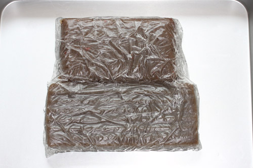 コンソメスープから取出した蒟蒻をキッチンペーパーで表面の水分を拭き取った後充分冷ましてからピチットシートで覆い冷蔵庫で1日寝かせます。