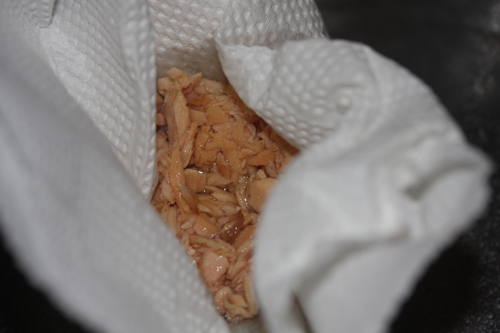 油があると煙がのらないためキッチンペーパー等で絞って油を抜きます。後はキッチンペーパに乗せたまま燻製します。