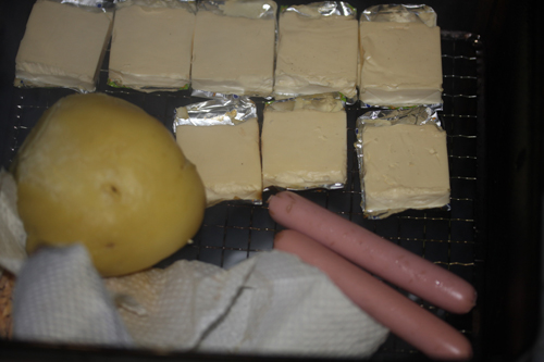 今回はじゃがいも、ゆで卵、シーチキン、魚肉ソーセージ辺りを燻製にして、燻製サラダを作ってみました。