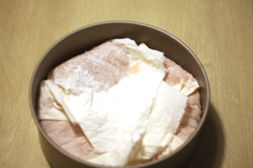 ランチョンミートなので型に入れてプレスします。ちなみに型はケーキ型を使用。