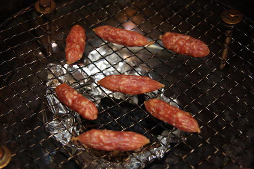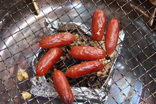 火力を強火から弱火にして網の上に、サラミを乗せたら蓋をする。あとはこのまま30分。